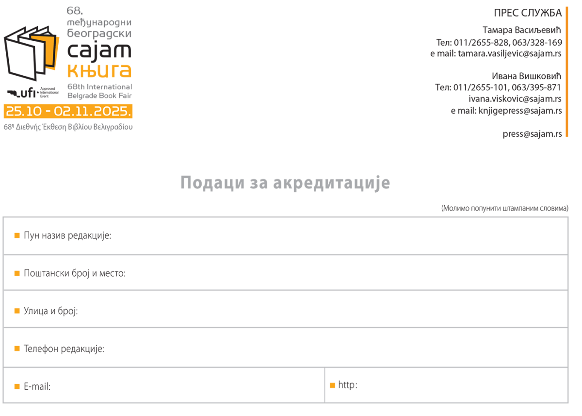 Ukoliko izveštavate o događanjima na Međunarodnom beogradskom sajmu knjiga, neophodno je da se na vreme akreditujete. Popunjeni i overeni formular treba proslediti Pres službi na adresu knjigepress@sajam.rs.
